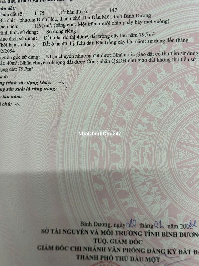 Gia đình mình có việc, đầu xuân năm mới mình cần bán thửa đất số 1175, tờ bản đồ số 147, phường Chánh Hiệp, Thành phố Hồ Chí Minh với diện tích 120m2 đã có sổ hồng riêng. Vị trí đất tọa lạc ngày cửa ngõ vào Trung tâm Thành phố mới Bình Dương, đường thông, rộng 2 xe hơi tránh nhau; khu vực xung quanh đã xây kín hết nhà, dân trí cao, hàng xóm thân thiện. Giá mình bán chính chủ bằng giá mình mua cách đây 6 năm chứ xung quanh họ bán lô đất hơn 2 tỷ. Khách thiện chí liên hệ: ***