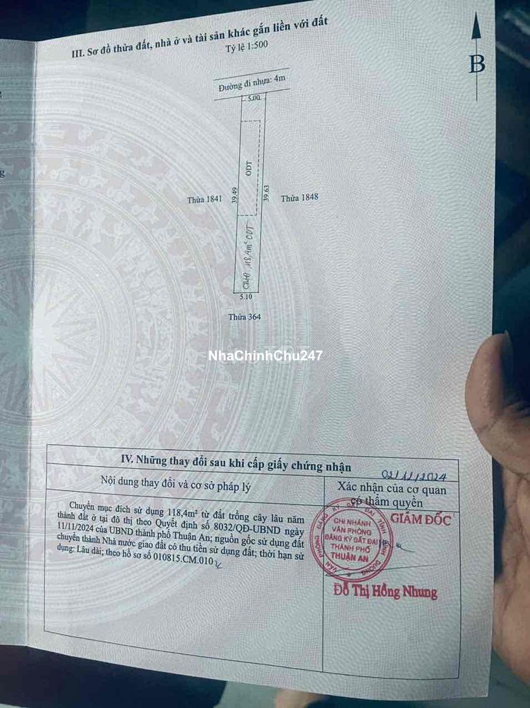 BÁN ĐẤT THỔ CƯ TOÀN BỘ – GIÁ CHỈ 26 TRIỆU/M² – VĨNH PHÚ, THUẬN An ( cũ) 📍 THÔNG TIN CHI TIẾT LÔ ĐẤT • 📌 Vị trí: Phường Vĩnh Phú ( cũ) • 📐 Diện tích: 199.5m² • 🏠 Thổ cư (ODT): Toàn bộ 199.5m² • 📏 Kích thước: Ngang 5m – Dài ~39m • 🛣 Đường nhựa trước đất: 4m • 📄 Pháp lý: Sổ hồng riêng, đã chuyển mục đích sử dụng đất đầy đủ • 💰 Giá bán: 26 triệu/m² 👉 Tổng giá cực kỳ hợp lý cho vị trí tiềm năng khu vực giáp TP.HCM. ⸻ 🌟 ƯU ĐIỂM NỔI BẬT ✅ 1. Thổ cư 100% – Xây dựng tự do Đất đã chuyển mục đích toàn bộ sang đất ở đô thị (ODT). Khách mua có thể xin phép xây dựng ngay, không lo quy hoạch treo. ✅ 2. Vị trí chiến lược – Giáp TP.HCM • Kết nối nhanh Quốc lộ 13 • Di chuyển thuận tiện về TP.HCM chỉ vài phút • Khu dân cư hiện hữu, an ninh, dân trí cao ✅ 3. Phù hợp nhiều mục đích • Xây nhà ở lâu dài • Xây nhà trọ/cho thuê • Giữ tài sản, đầu tư trung hạn • Làm văn phòng, kho nhỏ ⸻ 📈 TIỀM NĂNG TĂNG GIÁ CAO Vĩnh Phú là khu vực: • Sát TP Thủ Đức • Hạ tầng phát triển nhanh • Dân cư đông, nhu cầu nhà ở cao Trong bối cảnh quỹ đất thổ cư ngày càng khan hiếm, đất thổ cư toàn bộ, sổ riêng, giá 26tr/m² là mức giá rất cạnh tranh so với khu vực lân cận.