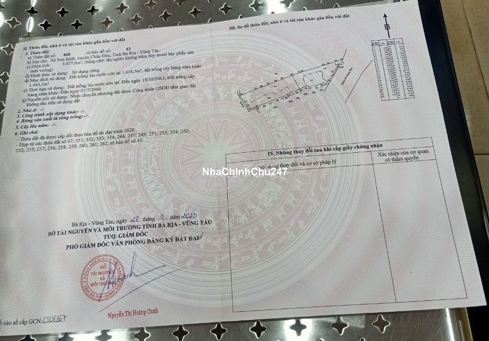 Bán đất mặt tiền đường nhựa 7m tim vàng, đường liên xã Sơn Bình, Châu Đức, Bà Rịa - Vũng Tàu (sắp tới là Tp.HCM) - Vị trí: Phía trước là dòng kênh nước từ Hồ Sông Ray, nước chảy quanh năm, bao mát mẻ thơ mộng. Phía sau là rừng Sao mát mẻ trong lành. - Hướng chính Đông: Hướng đón gió và lộc tài. - Cách Thác Xuân Sơn chỉ 1km, cuối tuần vui chơi. - Cách biển Hồ Tràm chỉ 18km, tiềm năng phát triển du lịch & nghỉ dưỡng. - Tiện ích xung quanh: Nằm kế bên khu dân cư, điện nước đầy đủ. Tiềm năng sử dụng: - Thích hợp làm nhà vườn, kho, nhà xưởng... điện nước không thiếu thứ gì. - C�� điều kiện tuyệt vời để nuôi yến với rừng và suối gần kề. - Hoặc cải tạo thành khu nghỉ dưỡng bao mát mẻ trong lành, cảnh quan đẹp. Dọc tuyến đường có nhiều view nghỉ dưỡng Diện tích: 3078m². - Giá chỉ: 2 tỷ 250 triệu (Chỉ 730 nghìn/m2). - Đất chính chủ, sổ hồng sẵn cầm tay, sang tên nhanh gọn. - HH: 2%.