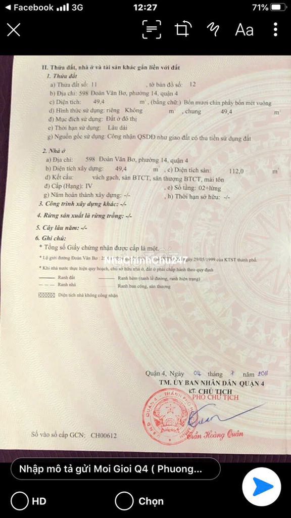 Bán nhà mặt tiền 598 Đoàn văn Bơ Phường 14 Q4.. có sổ Hồng.. vay được ngân hàng.. thanh khoãn tốt.. dễ bán dễ cho thuê.. hiện giá cho thuê 18 tr/ 1 tháng.. mua về có dòng tiền ngay.. sát trung tâm Q1.. 5phút đến ngay Nguyễn Huệ Q1.. mặt bằng đẹp có thể mở tiệm nail, tiệm tóc, cửa hàng Bách hóa, tiệm vàng, shop quần áo.. kho chứa hàng...Nơi có mật độ dân cư cực kì đông đúc.. mọi nhu cầu mua bán xin vui lòng call ***.( chính chủ ). P/S..49 m vuông.. ngang 3m dài 17m..1 trệt ,1 lững , 1 lầu, 2 tolet.