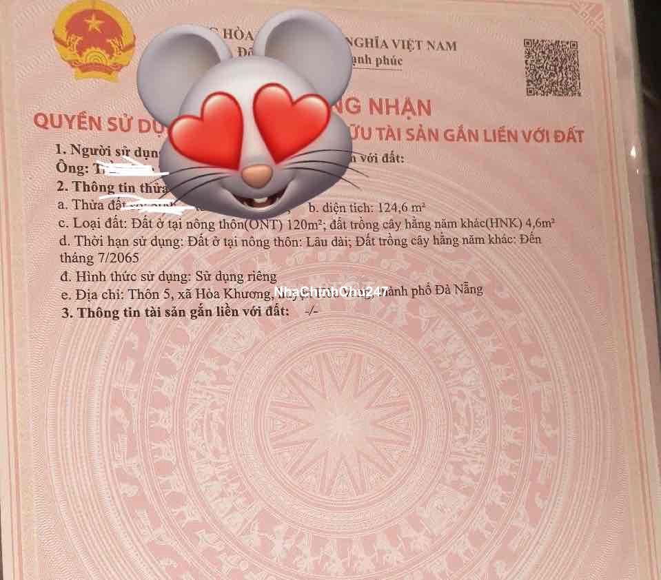 Dự án: Thông tin chi tiết: 🌳Em chính chủ cần bán lô thôn 5 Hoà Khương Hoà Vang, Dtich 124,6m2(ngang 5,6m) 120m đất ở Hướng ĐB. Đợt lụt gần nhất không bị ngập, khô ráo đường 5m, đối diện lô đất sắp hình thành khu nghỉ dưỡng vườn dừa 🪴Tiện ích xung quanh cách đất - Trường Trung Cấp Việt Ý, nhà văn hoá 100m đi bộ cũng tới nơi - tiểu học Hoà khương 1 , sân Bóng Tiên phong, Ra QL14B... đi 3 phút - UBND, tt y tế, trường mầm non, cấp 2 đi 5phut - Vành đai phia Tây vào 100met đến đất, xe tải vật liệu vào tận nơi. Khu vực an ninh - Nằm trục đường chinh đến các khu du lịch sinh thái (bà nà, hoà phú thành, núi thần tài, Hoà Bắc…) tiềm năng sinh lời cao - Dân cư đông đúc, Đường 5m, đất sạch đẹp không mồ mã. 🌹Giá LHCC : 12xx ,