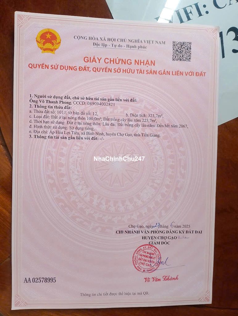 Chính chủ cần bán đất xã Bình Ninh - Chợ Gạo DT 323m (100m thổ)