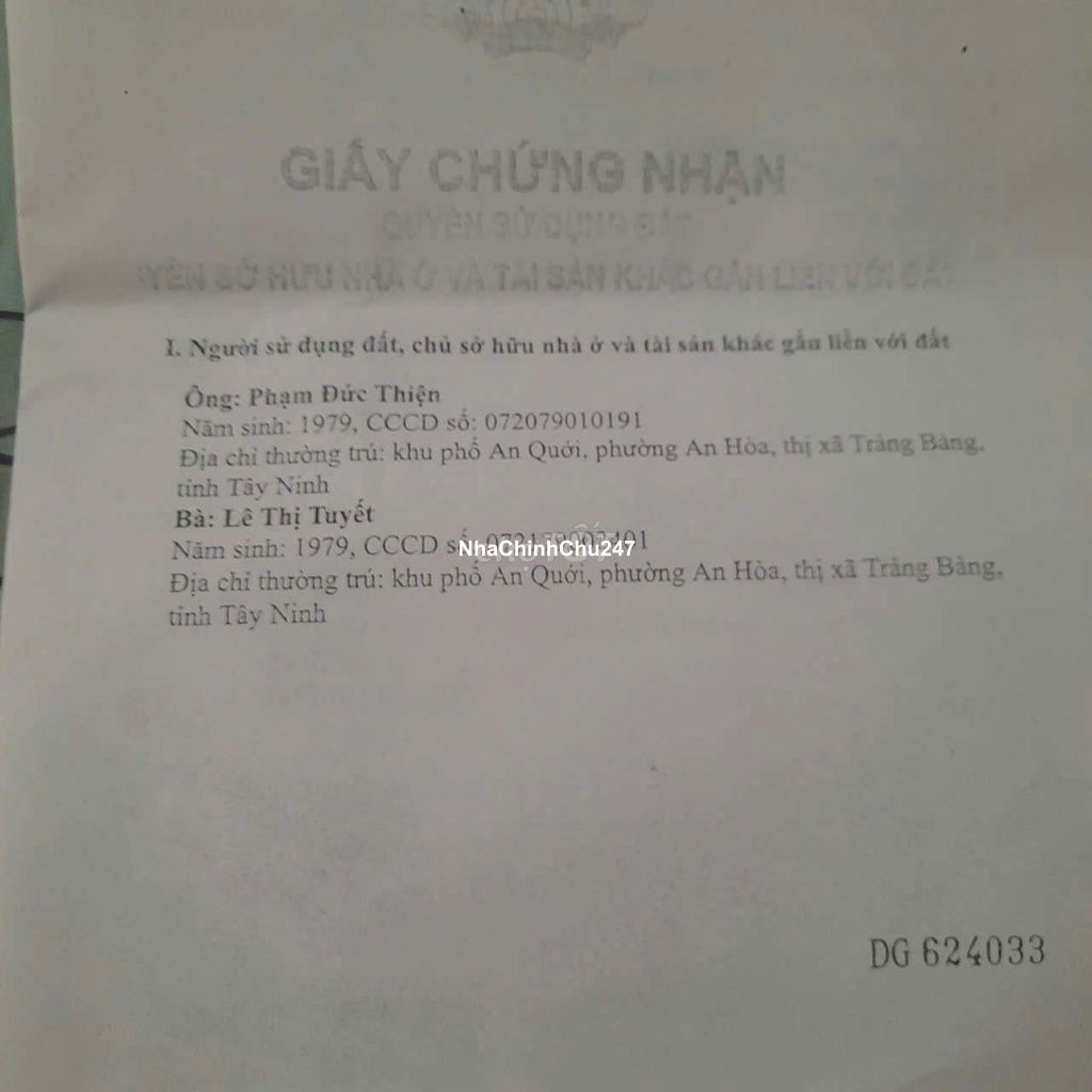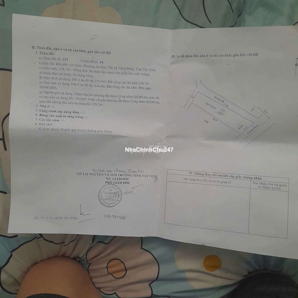 **Vị trí:** Khu phố An Quới, Phường An Hòa, TX. Trảng Bàng, Tây Ninh. Vị trí giao thông thuận tiện, khu dân cư hiện hữu. CÁCH KCN THÀNH THÀNH CÔNG 1KM **Diện tích:** 378,7 m^2 (ngang khoảng 11m, dài hơn 40m). Đất vuông vức, cực kỳ thoáng. **Pháp lý:** Sổ hồng riêng, công chứng ngay. Có sẵn 150 m^2 đất ở đô thị (ONT), thoải mái xây dựng biệt thự vườn hoặc nhà xưởng nhỏ. **Ưu điểm:** Đất giáp đường nhựa lớn, kết nối nhanh ra các tuyến đường huyết mạch của Trảng Bàng. Phù hợp đầu tư sinh lời hoặc định cư lâu dài. * **Giá bán:** 2tỷ5 (Có thương lượng mạnh cho khách thiện chí). * **Liên hệ:** 0938952750 chị Hiếu để xem sổ và xem đất trực tiếp.