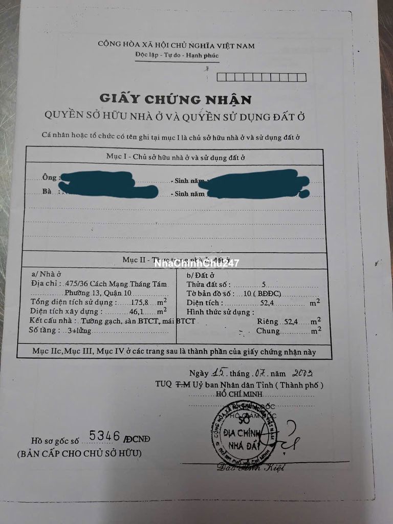 HHMG 1%, chính chủ bán HXH 7m 475/36 đường Cách Mạng Tháng 8 P13 Q10, DT: 3,5x18,7m, DTCN 53m2, Trệt, lửng, 3 lầu, Sân Thượng, Nhà 2 mặt tiền trước, sau thông thoáng, thích hợp ở hoặc cho thuê.