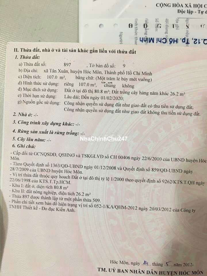 Mặt tiền nhựa Tân Xuân 3 -Hóc Môn Diện tích đất 5x21 sổ Hồng Riêng 107m2 có 80,7m2 thổ cư Dân cư hiện hữu xây dựng tự do và hoàn công liền Buôn bán và mở cửa hàng ok... Giá: 5 tỷ 500 thương lượng